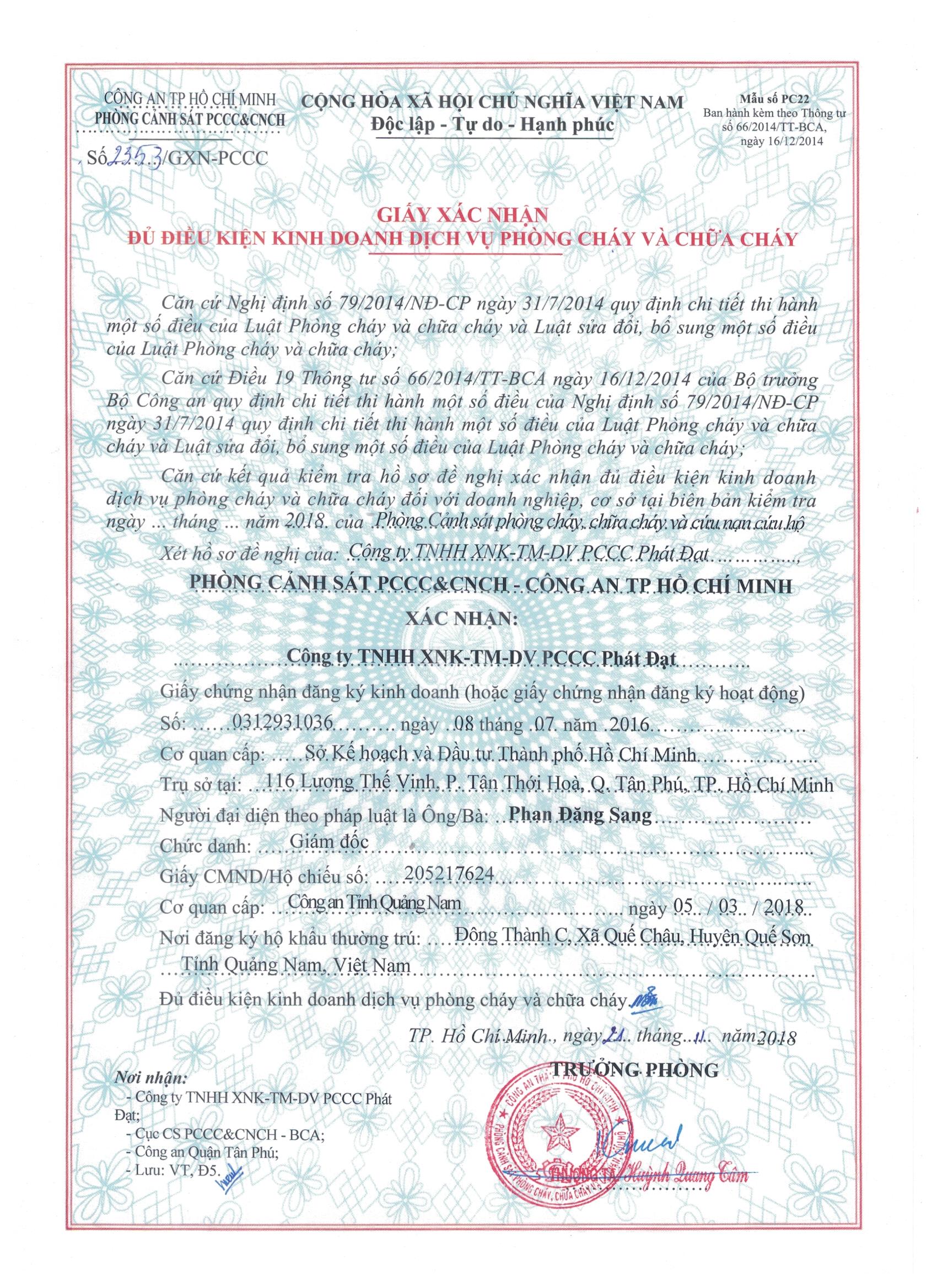 PCCC Phát Đạt có đầy đủ giấy chứng nhận đủ điều kiện kinh doanh PCCC :